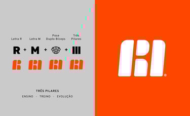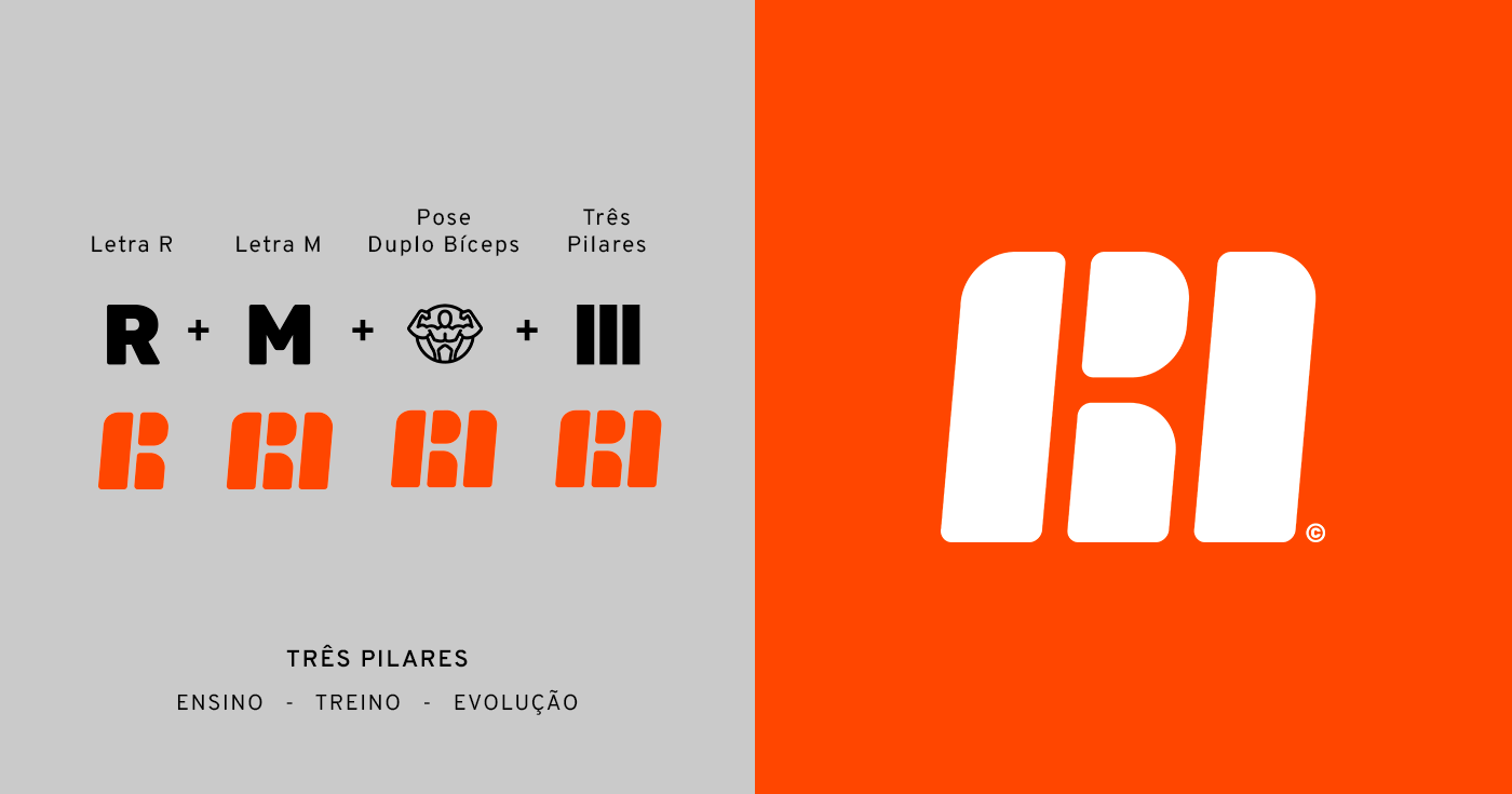A construção do símbolo teve como base a representação de quatro elementos importantes, o “R”, o “M”, a pose “duplo bíceps” e as três linhas verticais representando os três pilares da marca, a saber, ENSINO, TREINO E EVOLUÇÃO.